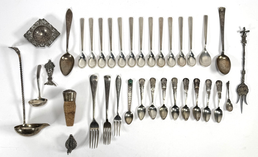 1136. Zilveren bestek - lepels, vorken, sauslepel, flesstopper en theelepels, 19e/20e eeuw