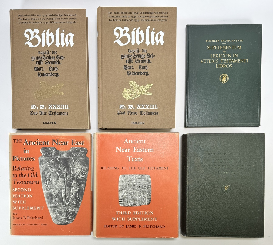 Lot boeken van Koehler, Baumgartner, James B. Pritchard en Taschen, vervaardigd uit linnen en kartonnen uitgeversbanden met stofomslagen en facsimiledruk. Het zesdelige lot omvat oudtestamentische lexica, standaardwerken over het Oude Nabije Oosten en een tweedelige facsimile van de Lutherbijbel van 1534. De uitgaven dateren uit 1953, 1958, 1969 en begin 21e eeuw en hebben een Nederlands, Amerikaans en Duits uitgeversverleden.