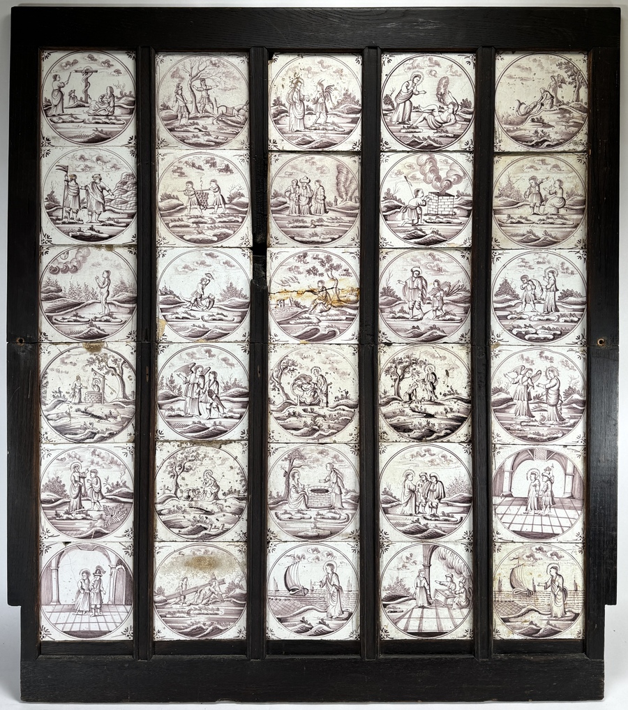 Tegeltableau uit de barokke periode, vervaardigd uit keramiek met handbeschilderde Bijbelse voorstellingen in mangaan. Het paneel bevat dertig tinglazuur tegels met diverse voorstellingen uit het Oude en Nieuwe Testament binnen cirkelvormige kaders en karakteristieke hoekmotieven. Het Delftse tableau dateert uit de 18e eeuw en heeft een Nederlandse herkomst, in een houten omlijsting.