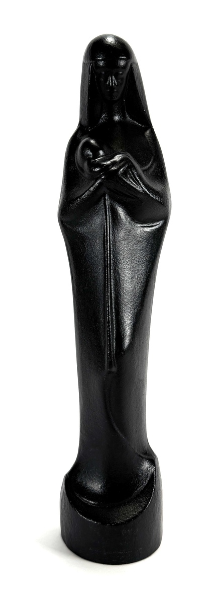 Beeld door Steph Uiterwaal (1889–1960) uit de Art Deco periode, vervaardigd uit gietijzer. De gestileerde weergave van een Madonna met kind vertoont de voor de kunstenaar kenmerkende verticale lijnvoering en gesloten vormtaal. Het ontwerp uit de jaren 1925–1928 is vooral bekend in persglas, waardoor deze gietijzeren uitvoering een minder voorkomende variant vormt. Het beeld heeft een Nederlandse herkomst.
