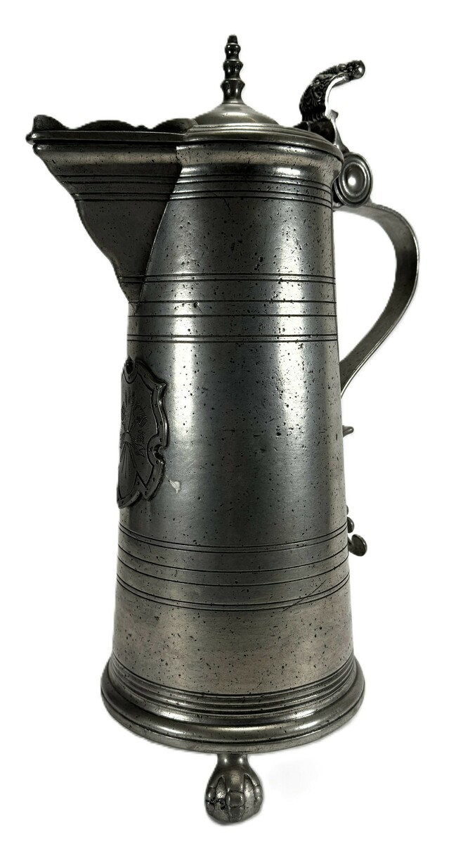 Gildekan uit de vroege 19e eeuw, vervaardigd uit tin met gegoten en gegraveerde details. De conische kan is voorzien van een scharnierend deksel met balusterknop en rust op drie leeuwenpoten. Op de voorzijde bevindt zich een gegraveerd wapenschild met gilde-insignes. Gemerkt aan de binnenzijde met een roosstempel en aan de onderzijde met diverse gietersmerken. De gildekan heeft een Noord-Europese herkomst.