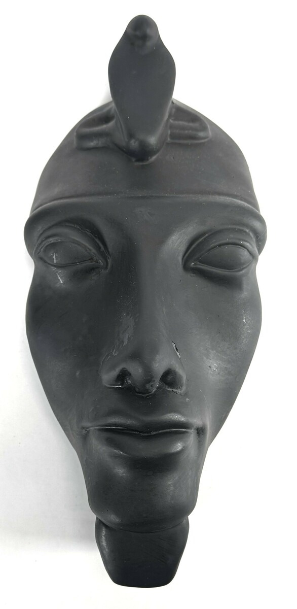 Egyptisch wandmasker uit de late 20e eeuw, uitgevoerd in een zwart geverfd steen. Het masker toont een faraonisch gelaat met elementen zoals de uraeus-slang op het voorhoofd en een ceremoniële koningsbaard.