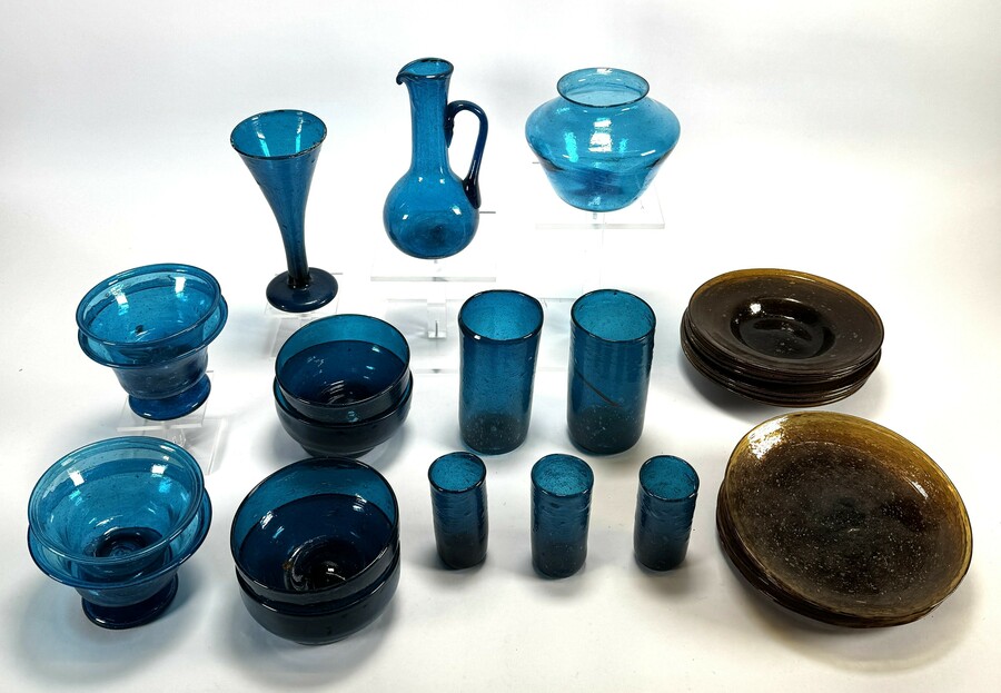Servies van mondgeblazen glas vervaardigd uit bubbelglas in diverse blauw -en bruintinten. De kavel bestaat uit onder andere een schenkkan, glazen, coupes en vaas, met een pontil aan de onderzijden, datering midden 20e eeuw.