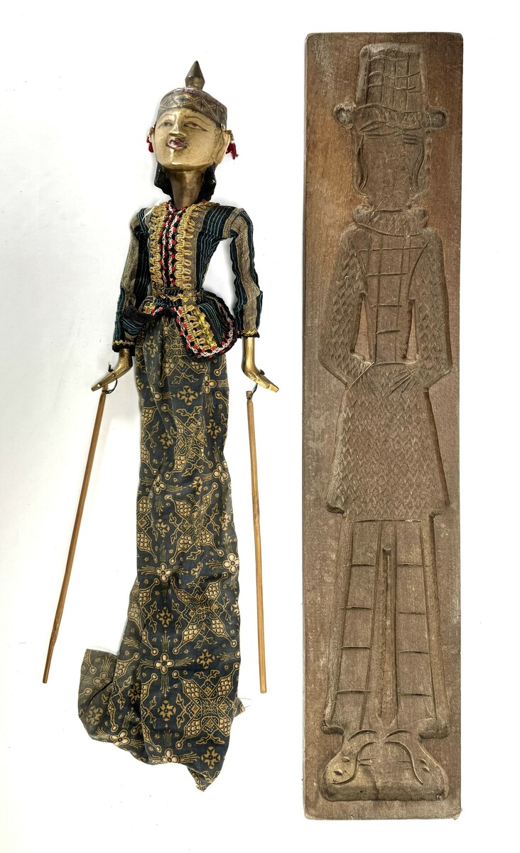 Wayang Golek en speculaasplank in Javaanse en volkskunsttraditie, vervaardigd uit gesneden hout, textiel en bamboe, respectievelijk uit hout met steekwerk in reliëf. De wajang pop heeft een beschilderd hoofd, goudkleurige handen en een lang gewaad met batikachtig patroon, terwijl de plank een staande figuur met hoofdtooi en geometrisch uitgewerkte romp toont. Datering 20e eeuw en een herkomst in Indonesië en Nederland.