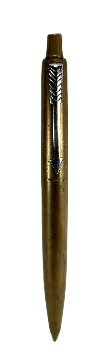Etalage pen van Parker Pen Company vervaardigd uit brons met een verchroomde pijlclip. De uitvoering in groot formaat diende oorspronkelijk als promotionele decoratie en toont de vormgeving van de klassieke Parker pen. Datering ca. 1970 en een internationale herkomst.