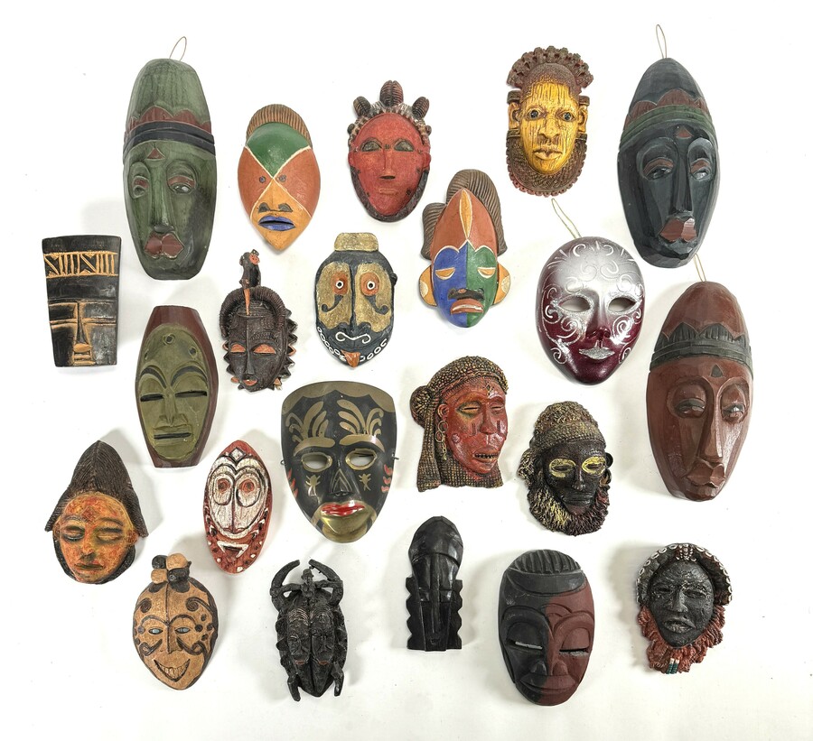West-Afrikaanse verzameling mini maskers uit eind 20e eeuw, uitgevoerd in diverse houtsoorten en keramiek met polychrome pigmentatie. De collectie bevat stilistische maskers van Baule, Fang en Songye tradities en moderne decoratieve maskers.