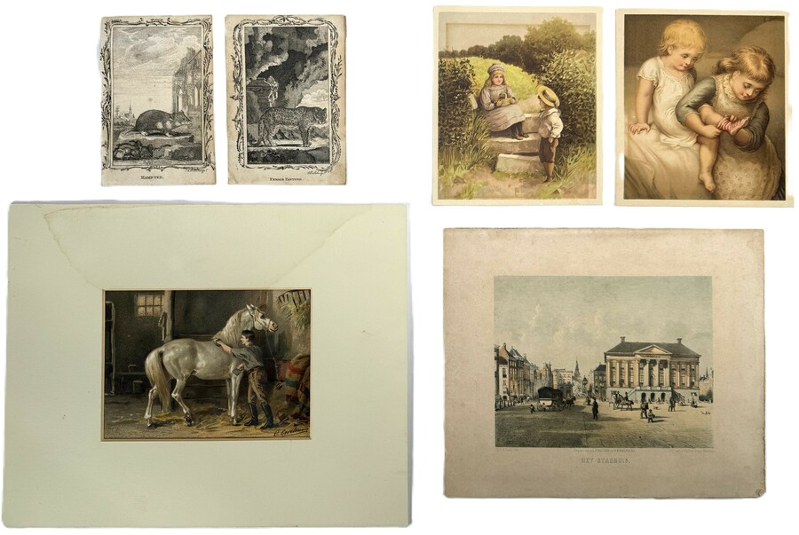 Verzameling van zes prenten van diverse makers waaronder Andrew Bell, Carel Christiaan Antony en Otto Eerelman, uitgevoerd in kopergravure en lithografie op papier, waaronder een topografisch stadsgezicht van Groningen en negentiende-eeuwse genretaferelen. De prenten dateren uit de periode 1775–1890 en hebben een Britse en Nederlandse herkomst.
