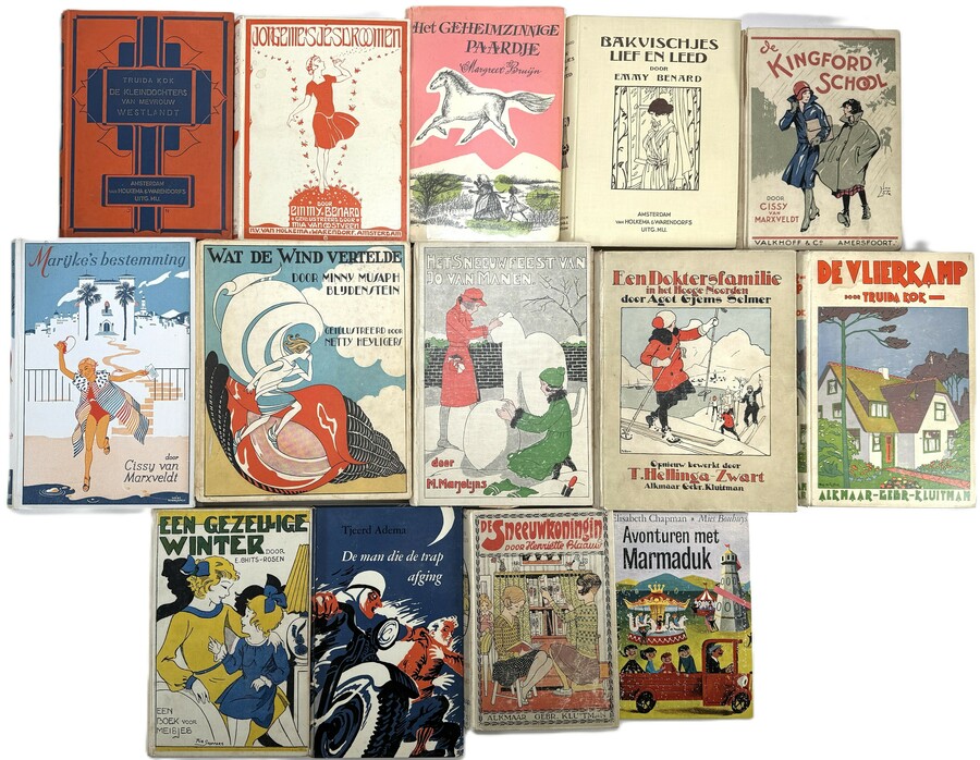 Lot boeken van diverse Nederlandse auteurs vervaardigd uit bedrukt papier, karton en linnen banden met kleurendruk en lijnillustraties. Het lot omvat veertien jeugdboeken waaronder titels van Cissy van Marxveldt, Emmy Benard en M. Marjolijns. Datering eerste helft 20e eeuw.