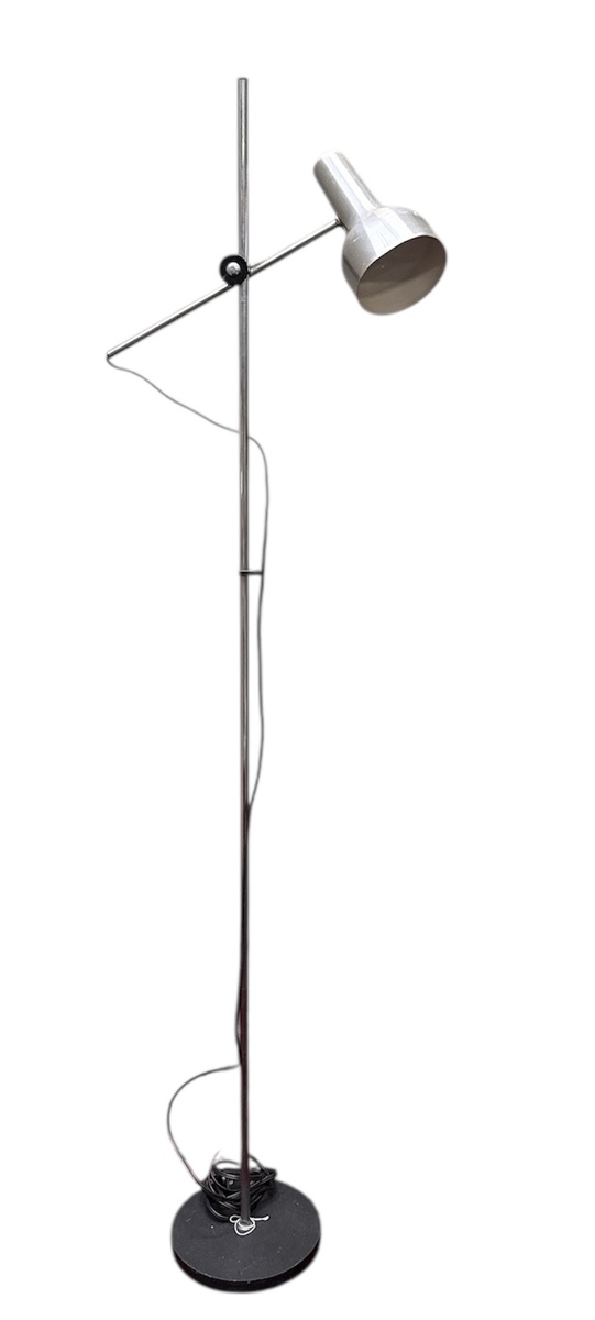 Vloerlamp vervaardigd uit verchroomd buismetaal met een zwart gelakte metalen voet. De lamp heeft kegelvormige spot die verticaal verstelbaar is langs de centrale as middels een kunststof draaiknop. Datering circa 1970 en een Europese herkomst.