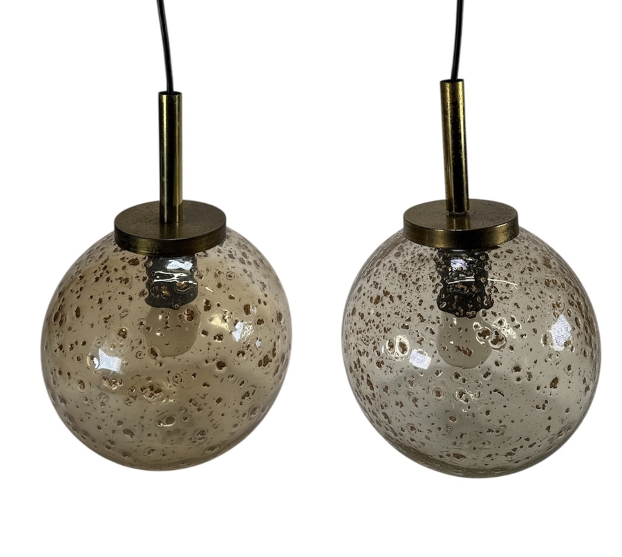 Twee hanglampen vervaardigd uit mondgeblazen glas en messing. De bolvormige kappen vertonen een dichte verspreiding van insluitsels en zijn voorzien van cilindrische messing monturen. Datering circa 1970 en een Europese herkomst.