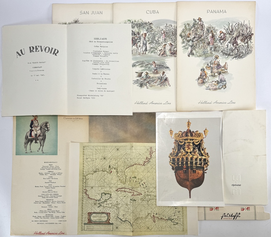 Lot maritieme memorabilia vervaardigd uit papier en karton met typografisch en meerkleurig drukwerk. Onder meer menukaarten, programmabladen en rederijdrukwerk van de Holland-Amerika Lijn en de Oranje Nassau, met havenscènes, routekaart en maritieme emblemen. Datering midden 20e eeuw en een Nederlandse herkomst.