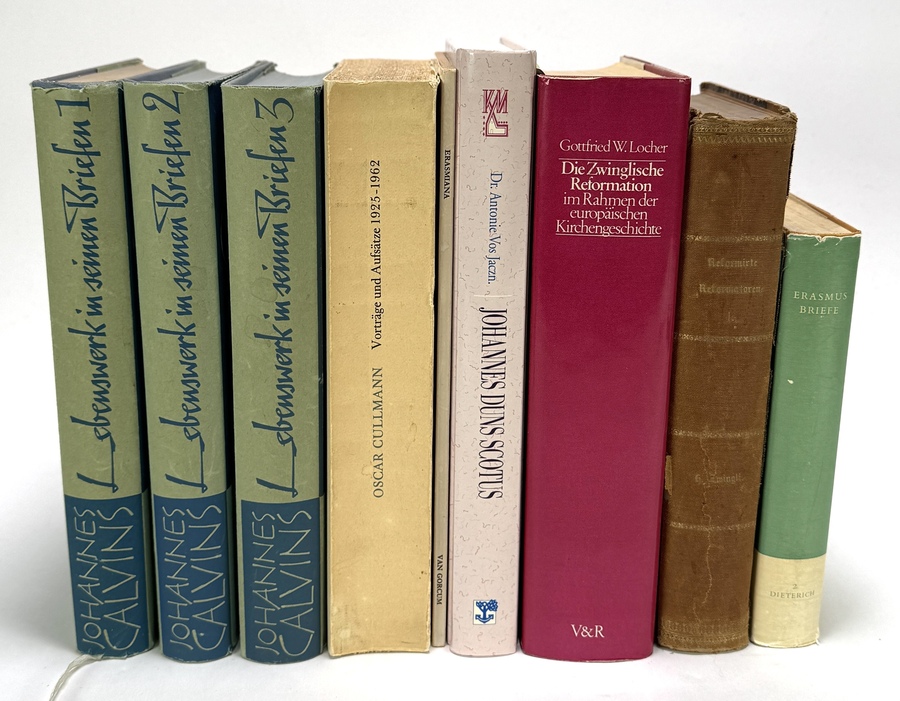 Boeken van diverse auteurs vervaardigd uit papier en gebonden in linnen of karton. De negendelige verzameling bevat titels over Calvijn, Erasmus, Zwingli en Duns Scotus. De banden tonen karakteristieke typografie en stofomslagen. Datering 1857-1994 en een Europese herkomst.