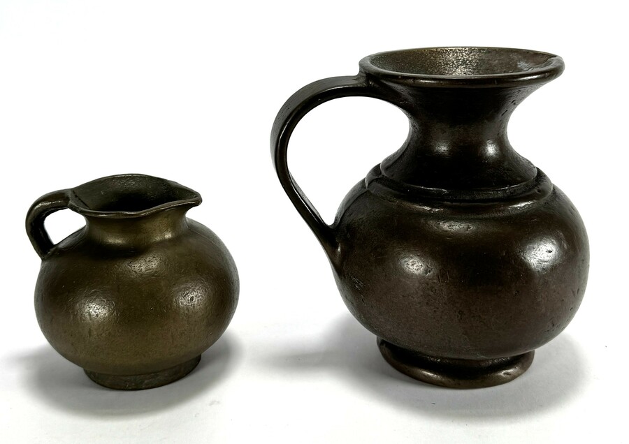 Kruiken van ambachtelijke makelij, vervaardigd uit messing met technieken als gieten en handmatig drijfwerk, van verschillend formaat, elk voorzien van een S-vormig oor en een geprofileerde voet. Datering 19e eeuw en een Europese herkomst.