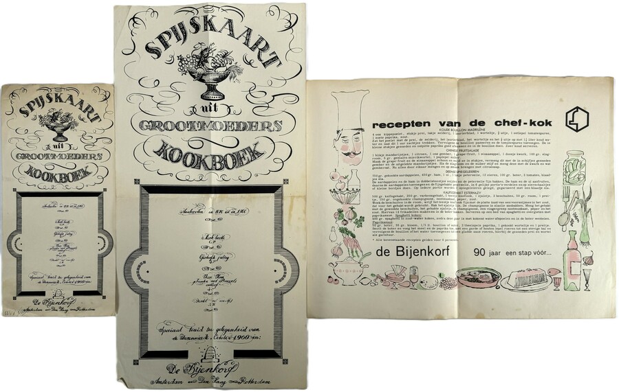 Culinaire affiches van De Bijenkorf vervaardigd uit papier met offsetdruk. De kavel bevat menukaarten uit "Grootmoeders Kookboek" en recepten van de chef-kok, ontworpen voor het jubileum in oktober 1960.