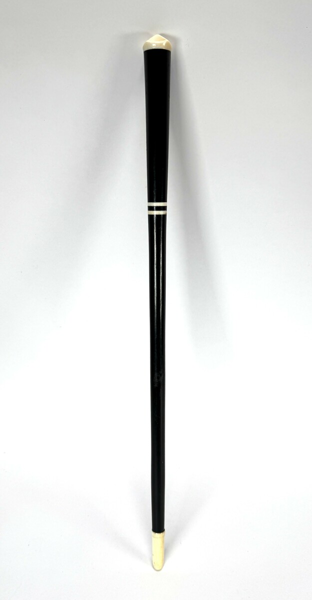 Wijsstok vervaardigd uit zwart gelakt hout met handgedraaide benen elementen. De slanke, zwart gepolijste schacht is gedecoreerd met een contrasterende inleg van benen ringen en een conische bekroning van hetzelfde materiaal. De wijsstok dateert uit het midden van de 20e eeuw en heeft een West-Europese herkomst.