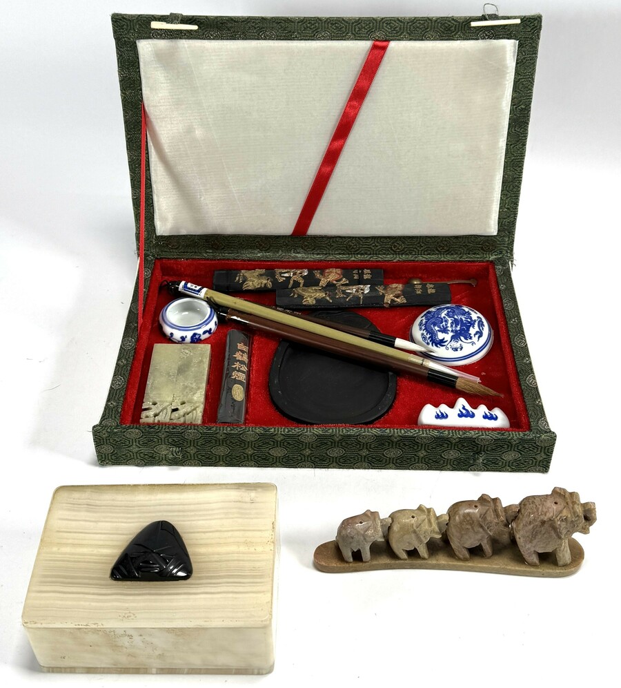 Chinese kalligrafie set, een doosje en een wierookbrander met vier olifanten in oosterse stijl, vervaardigd uit hout, steen en porselein met gesneden en beschilderde technieken. De kalligrafie set bevat penselen, inktsteen, inktstaven, zegelstenen, porseleinen waterpot en een penseelsteun. Datering tweede helft 20e eeuw.