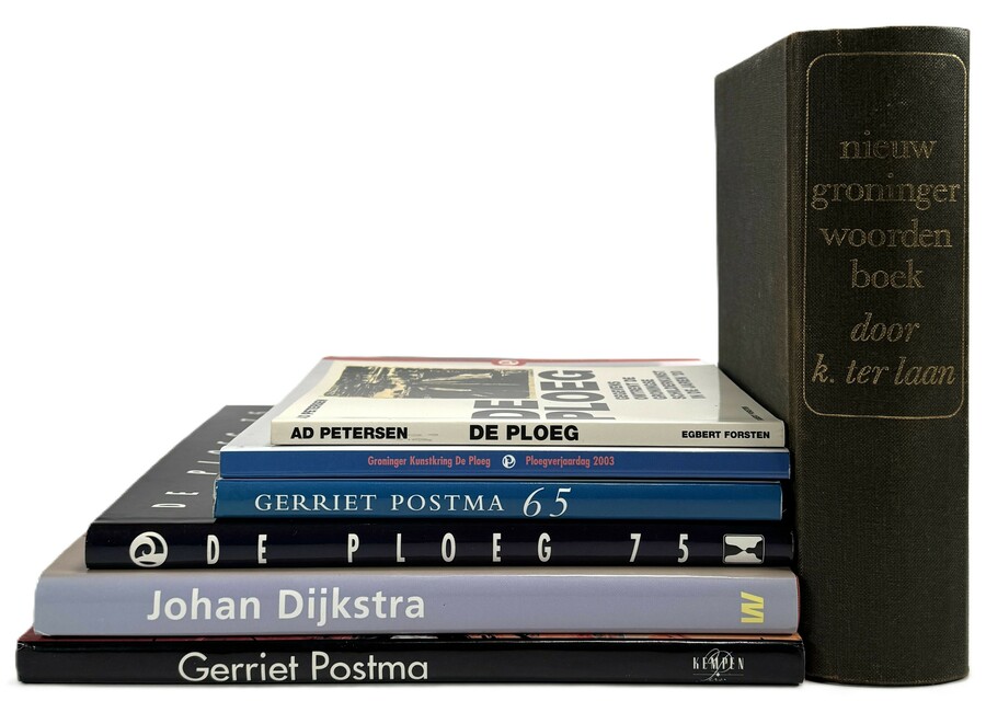 Boeken van diverse auteurs, vervaardigd uit papier en karton met gedrukte en kleurig geïllustreerde omslagen, waaronder titels over Gerriet Postma, Johan Dijkstra en kunstenaarskring De Ploeg, naast het Nieuw Groninger Woordenboek van K. ter Laan. Het lot omvat gebonden en ingenaaide banden, en een exemplaar met uitvouwkaart. Datering 20e/21e eeuw en een Nederlandse herkomst.
