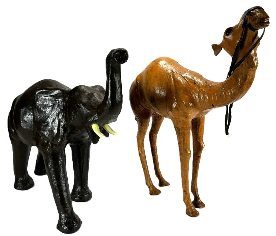 Een olifant en een dromedaris vervaardigd uit papier-maché bekleed met handgevormd leder. De dieren tonen realistische details, datering eind 20e eeuw en een Europese herkomst.
