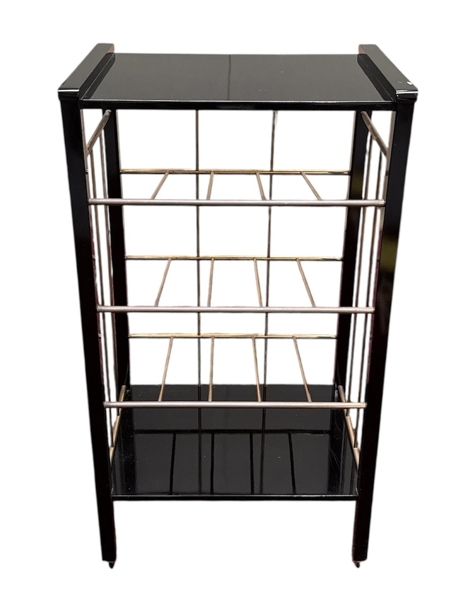 Tijdschrifthouder in Art Deco stijl, vervaardigd uit hout en messing met drie schuine compartimenten voor lectuur. De geometrische constructie is voorzien van een houten onderblad in zwart hoogglans en staat op vier zwenkwieltjes. De tijdschriftenhouder dateert uit de 21e eeuw en heeft een West-Europese herkomst.