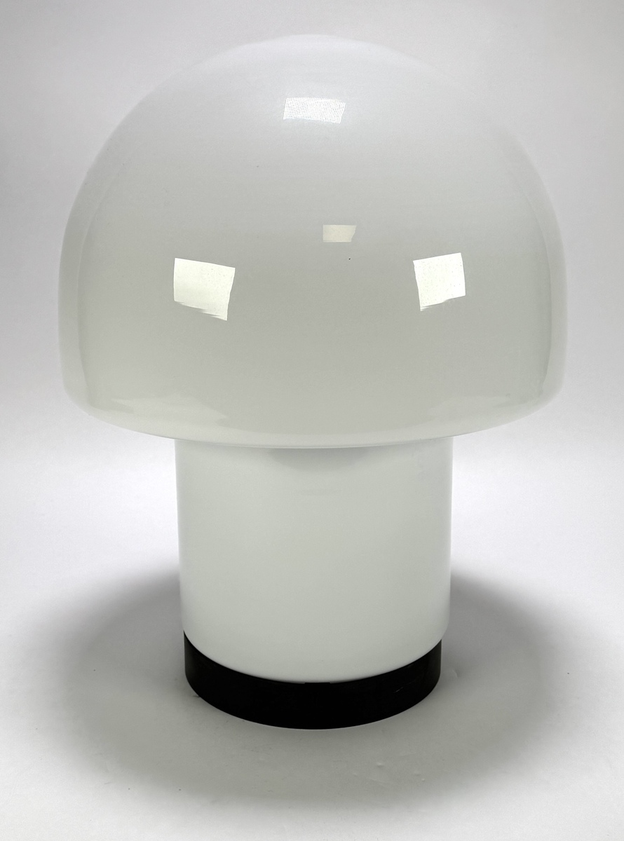 Mushroom tafellamp van Glashütte Limburg uit de Space Age periode, vervaardigd uit wit melkglas met een zwart metalen voetring. De paddenstoelvormige armatuur toont een naadloze overgang tussen de cilindrische voet en de halfronde kap. De tafellamp dateert uit circa 1975 en heeft een Duitse herkomst.
