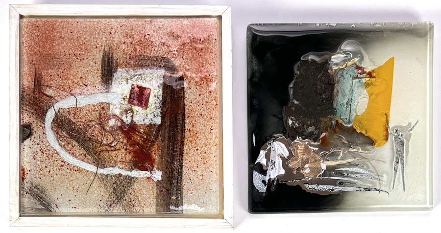 Wandtegels in moderne stijl, vervaardigd uit glas en gemengde techniek met abstracte composities. Een tegel is gevat in een houten lijst en toont een spikkeldecor in aardetinten en een tegel met figuratieve elementen in geel en zwart. De wandtegels dateren uit de tweede helft van de 20e eeuw en hebben een Europese herkomst.