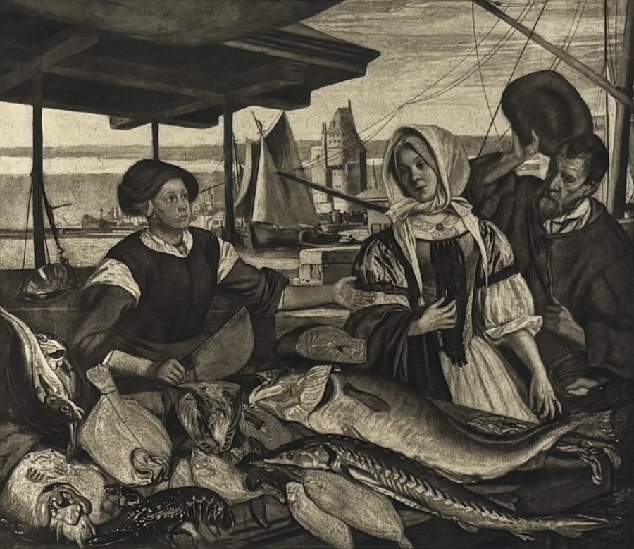 Fotogravure op papier naar Emanuel de Witte (1617–1692), toont een vismarkt met diverse figuren in barokstijl. Uitgegeven door de Vereeniging tot bevordering van beeldende kunsten in 1911 en gedrukt door Meisenbach Riffarth & Co. Berlin.