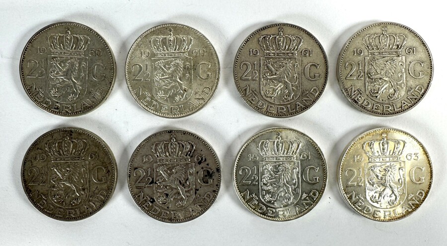 720/1000 zilveren rijksdaalders, acht circulatiemunten met het portret van koningin Juliana en op de keerzijde het gekroonde Nederlandse wapen met waarde aanduiding 2½ G. De geslagen serie omvat twee exemplaren uit 1960, vijf uit 1961 en één uit 1963. Het betreft Nederlands muntzilver met standaardgewicht van 15 gram per stuk.