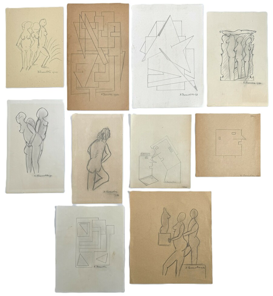 Tekeningen door Klaas Boonstra (1905–1999), uitgevoerd in potlood op papier; een verzameling van tien diverse studies in modernistische stijl. De set bevat zowel naaktfiguren als abstract-geometrische composities met een lineair karakter. Meerdere tekeningen zijn gesigneerd en gedateerd tussen 1930 en 1970.