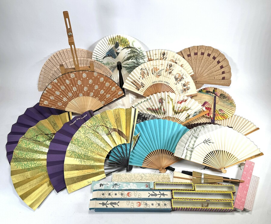 Verzameling waaiers van diverse internationale luchtvaartmaatschappijen, vervaardigd uit bamboe, papier en zijde met lithografische en handgeschilderde decors. Onder meer souvenir exemplaren van Qantas Empire Airways, Japan Air Lines en Cathay Pacific. Datering tweede helft 20e eeuw en een internationale herkomst.