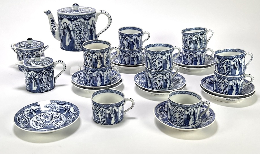 Servies van Mosa Maastricht, vervaardigd uit porselein met blauw-witte transferdruk in het decor Lange Lijs. Het servies bestaat uit een theepot, suikerpot, melkkan, kopjes en schotels, alle uitgevoerd met doorlopende panelen van staande Chinese vrouwen in een tuinsetting met bloeiende takken. Datering circa 1900 en heeft een Nederlandse herkomst.