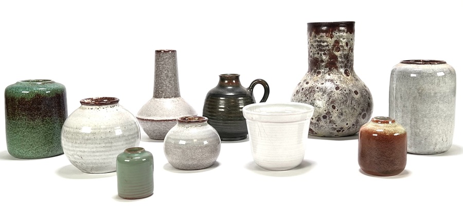 Vazen, bloempot en kan van Westraven Utrecht vervaardigd uit aardewerk met gedraaide en gegoten vormen met glazuur in wit, grijs, groen, zwart en roestbruin. Het lot omvat cilindrische, bolvormige en flesvormige modellen, waaronder een oorvaas en een halsmodel. Diverse onderzijden dragen ingeperste fabrieksmerken en modelnummers. Datering tweede helft 20e eeuw en een Nederlandse herkomst.