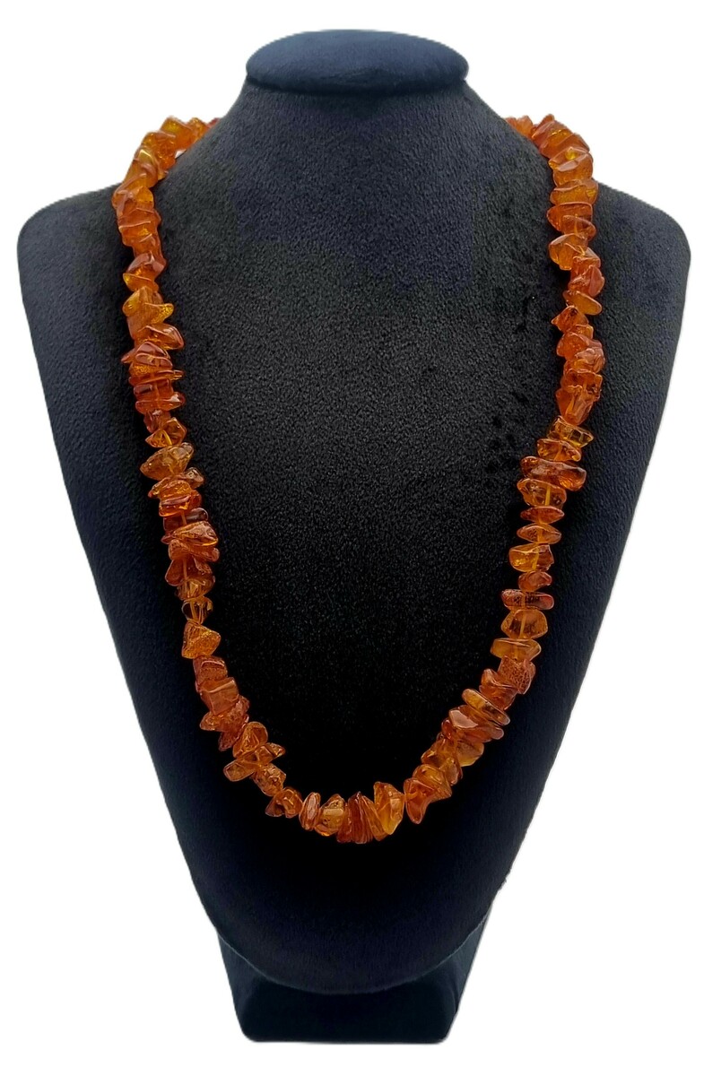 Halsketting van barnsteen met onregelmatig gevormde splitkralen, opgebouwd uit transparante en half transparante delen in honing- en cognackleurige nuances. De kralen zijn licht gepolijst en gesloten geregen, datering eind 20e eeuw.
