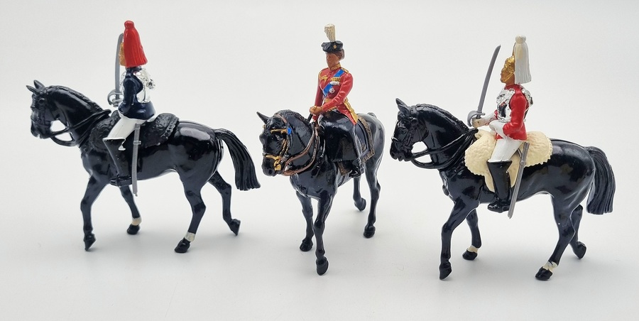 Gietmetalen handbeschilderde soldaatjes van Britains, met Her Majesty Queen Elizabeth centraal, geflankeerd door een mounted lifeguard en mounted horseguard op zwarte paarden. Geleverd in de originele rode vensterdoos, nummer 7233. De set dateert uit 1984 en heeft een Engelse herkomst.