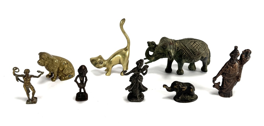 Bronzen en messing miniatuur beeldjes in eclectische stijl, vervaardigd met gietwerk. Acht kleine beeldjes met dier- en figuurvoorstellingen, waaronder een olifant, kat, aap en staande personages. De beeldjes tonen uiteenlopende patineringen en modelleringen. Datering 20e eeuw.