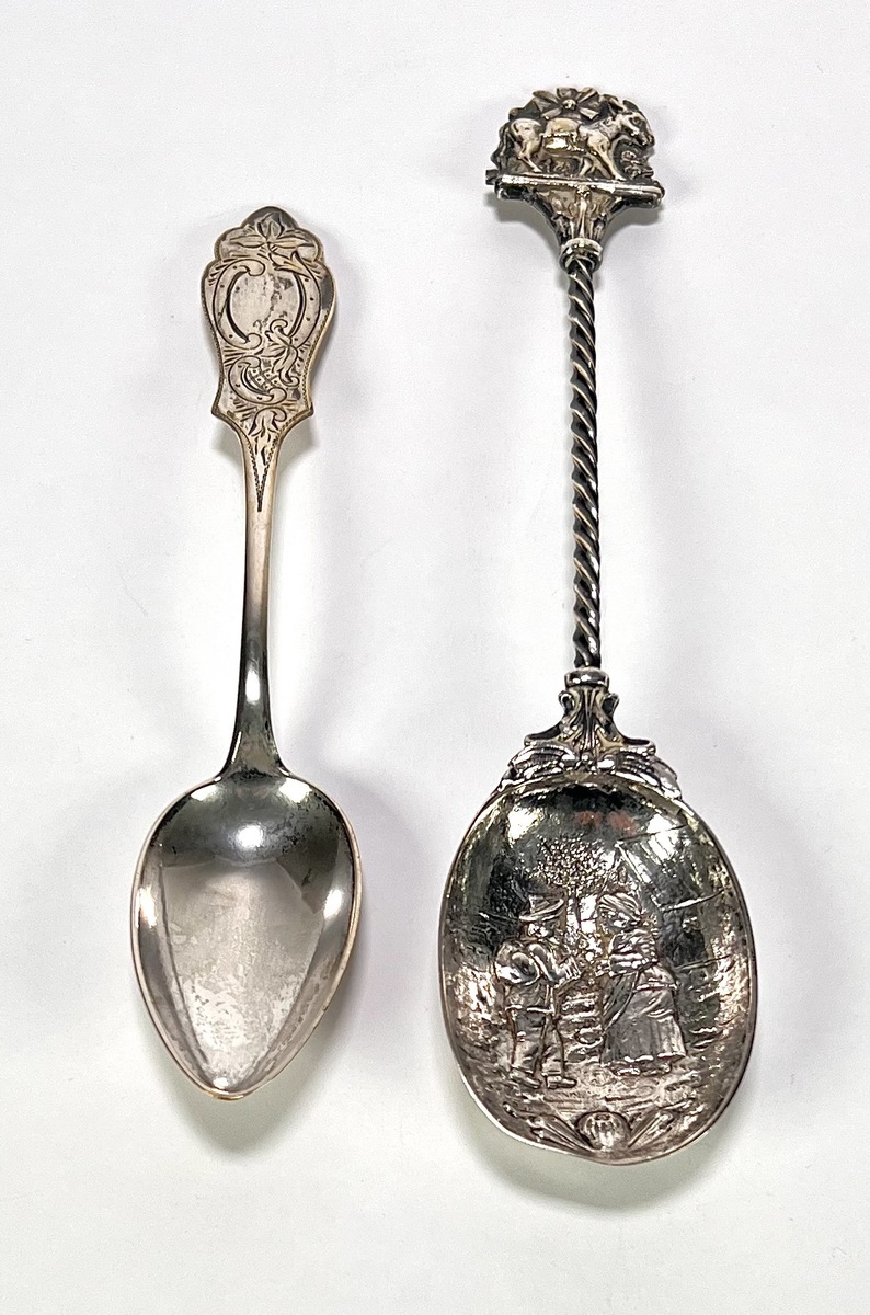 Twee 800/1000 zilveren lepels uit begin 20e eeuw, waaronder een herinneringslepel met een getordeerde steel eindigt in een bekroning van een molen en ezel, de bak toont een gedreven voorstelling van een paar in landschap. De andere lepel heeft een cartouche. Beide lepels zijn aan de achterzijde voorzien van het 800 zilvergehalte stempel.