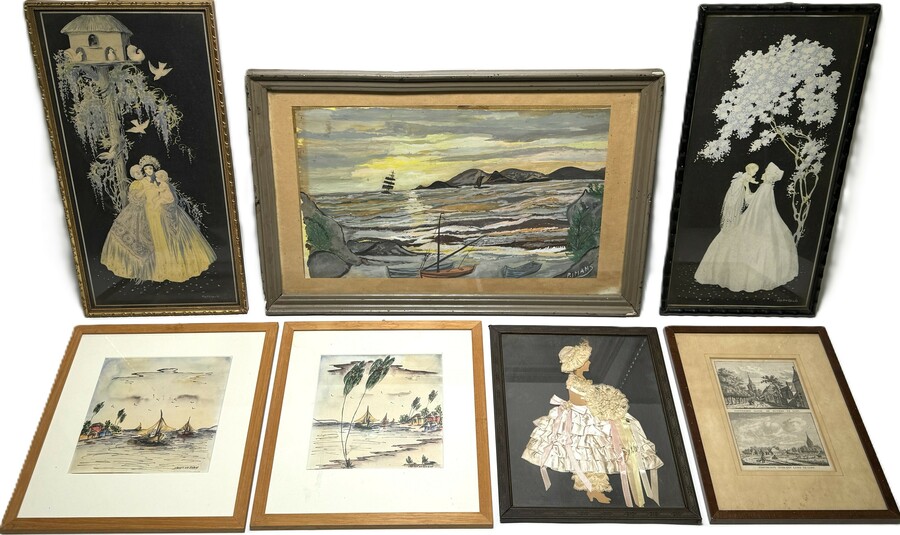 Convoluut lijstwerk samengesteld uit aquarellen, gravures en decoraties in lijst; maritieme voorstellingen, twee panelen met goudkleurige en crèmekleurige figuren, twee stadsgezichten en een collage met een modefiguur. Datering midden 20e eeuw en een Europese herkomst.