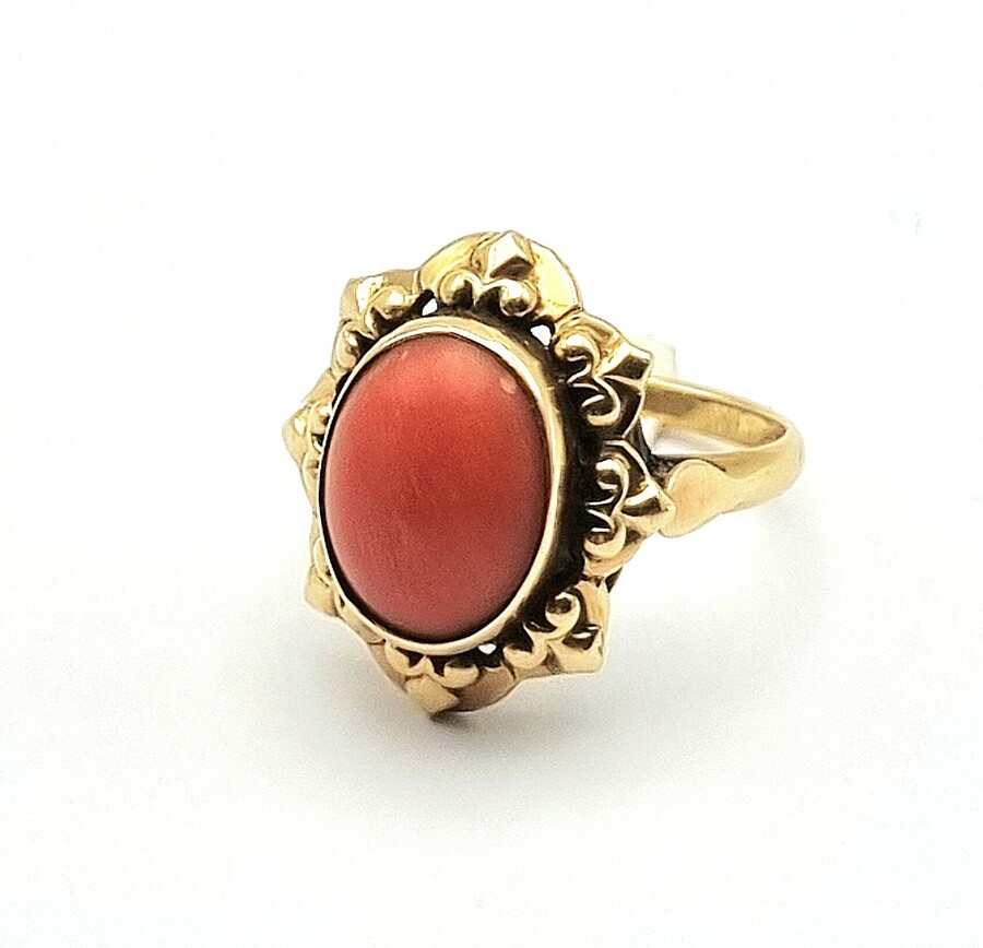 Gouden 14-karaats ring met bloedkoraal in een ovale cabochon geslepen vorm. Het sieraad is vervaardigd met een bewerkte zetting waarbij de centrale steen wordt omsloten door een geschulpte rand met subtiele ornamentiek. Getoetst, datering tweede helft 20e eeuw.