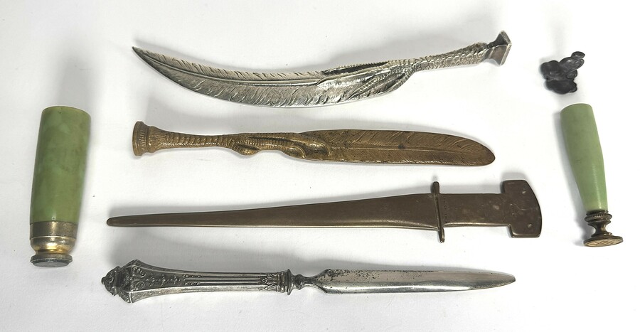 Brievenopeners en lakstempels samengesteld uit messing, witmetaal en groen hardsteen, met gegoten, gegraveerde en gestempelde afwerking. Vier brievenopeners, waaronder een zwaardvormig exemplaar, een verenmodel en een brievenopener met florale heftversiering en drie lakstempels met cilindrische greep. Datering eerste helft van de 20e eeuw en een Europese herkomst.