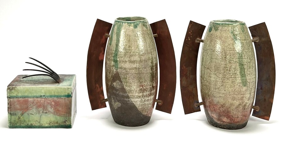 Twee vazen en dekseldoosje vervaardigd uit keramiek met Raku glazuur en koper. De balustervormige vazen dragen gebogen koperen zijkanten op cilindrische steunen, het rechthoekige doosje heeft een deksel met viertandig metalen greep. Gemerkt met ingekraste monogrammen en jaartal 1993 aan onderzijden en deksel.
