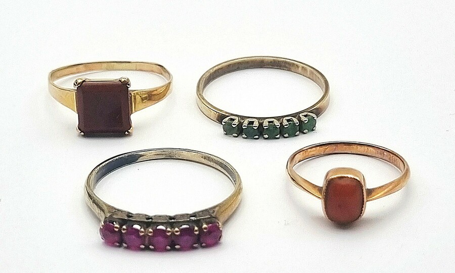 Vier gouden ringen, waarvan twee gemerkt 585 14 karaat, één getoetst als 14 karaat goud en één gemerkt 333 8 karaat. Uitgevoerd met groene en paarse stenen, jaspis en bloedkoraal. Datering tweede helft 20e eeuw.