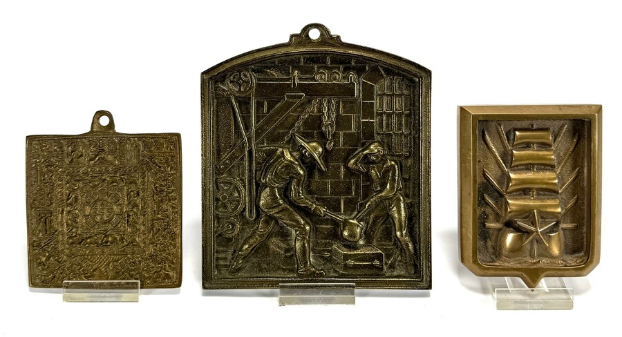 Bronzen plaquettes vervaardigd in reliëfgietwerk; een plaquette toont een Tibetaans astrologisch amulet of sipaho, een plaquette met een tafereel gieterij en draagt op de achterzijde het merk N.V. J. Zimmer & Zonen, Amsterdam en een plaquette met een maritiem wapenschild met driemaster. Datering eerste helft van de 20e eeuw.