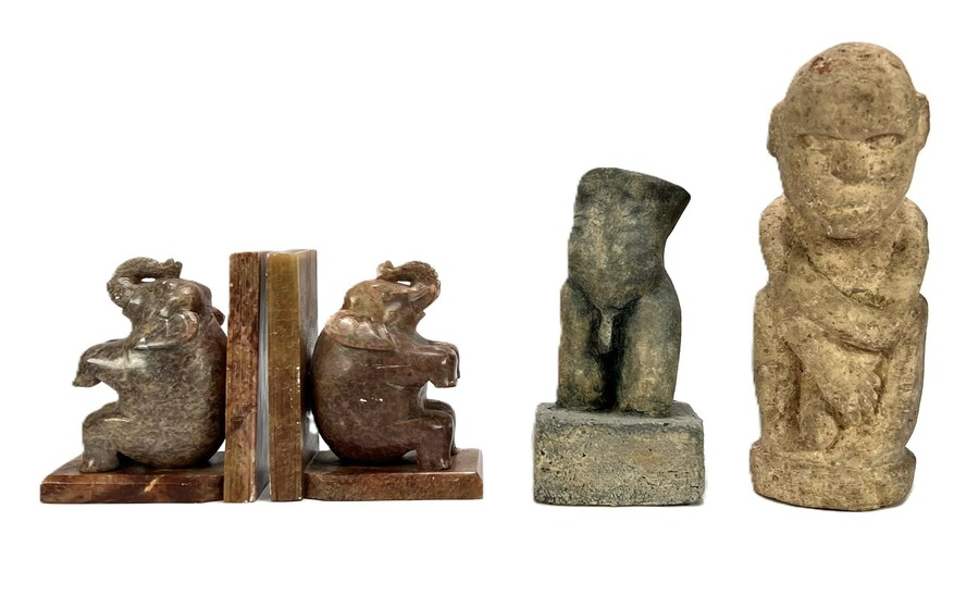 Boekensteunen en beelden in diverse stijlen, vervaardigd uit gepolijste natuursteen en aardewerk. De boekensteunen uit India tonen zittende olifanten, de beelden tonen een mannelijk torso en een primitief zittend figuur. Het torsobeeld is aan de onderzijde gesigneerd en gedateerd 2017. Datering laat-20e en vroeg 21e-eeuw met een internationale herkomst.