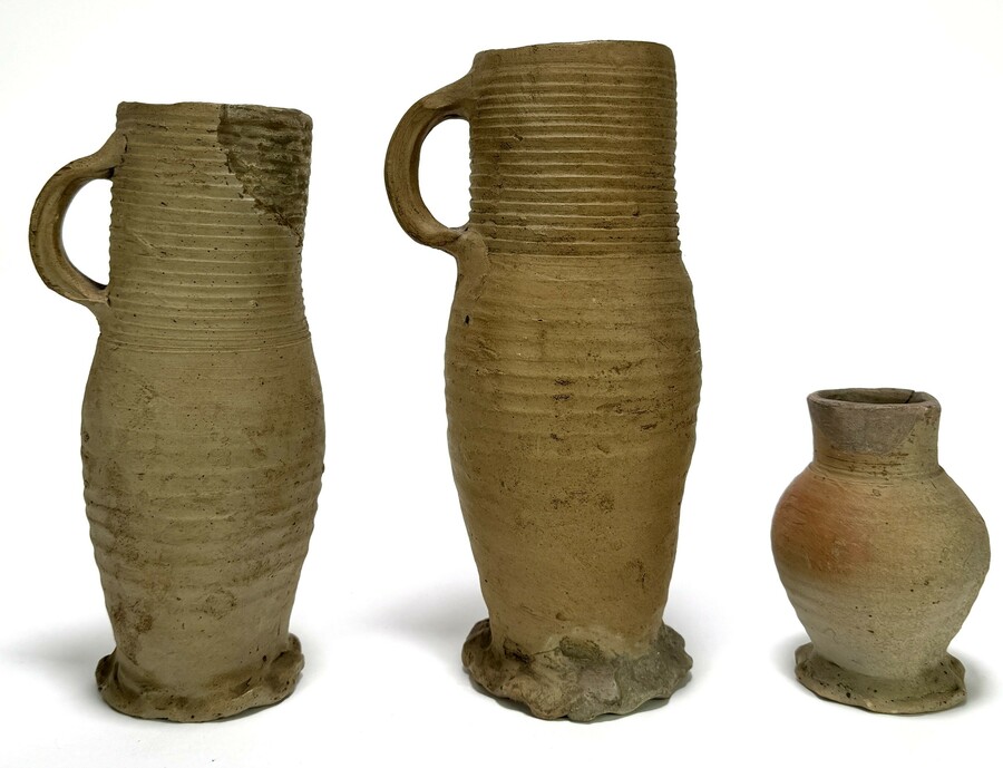 Laatmiddeleeuws steengoed bestaande uit twee Jacobakannen en een trechterbeker, 14e–15e eeuw, Siegburg of Raeren. De kannen vertonen de karakteristieke geknepen voet en hebben een verticaal lusoor. De trechterbeker heeft een gedrongen, buikig lichaam met een wijd uitlopende rand. Het zout geglazuurde oppervlak vertoont baksporen en lichte as neerslag.