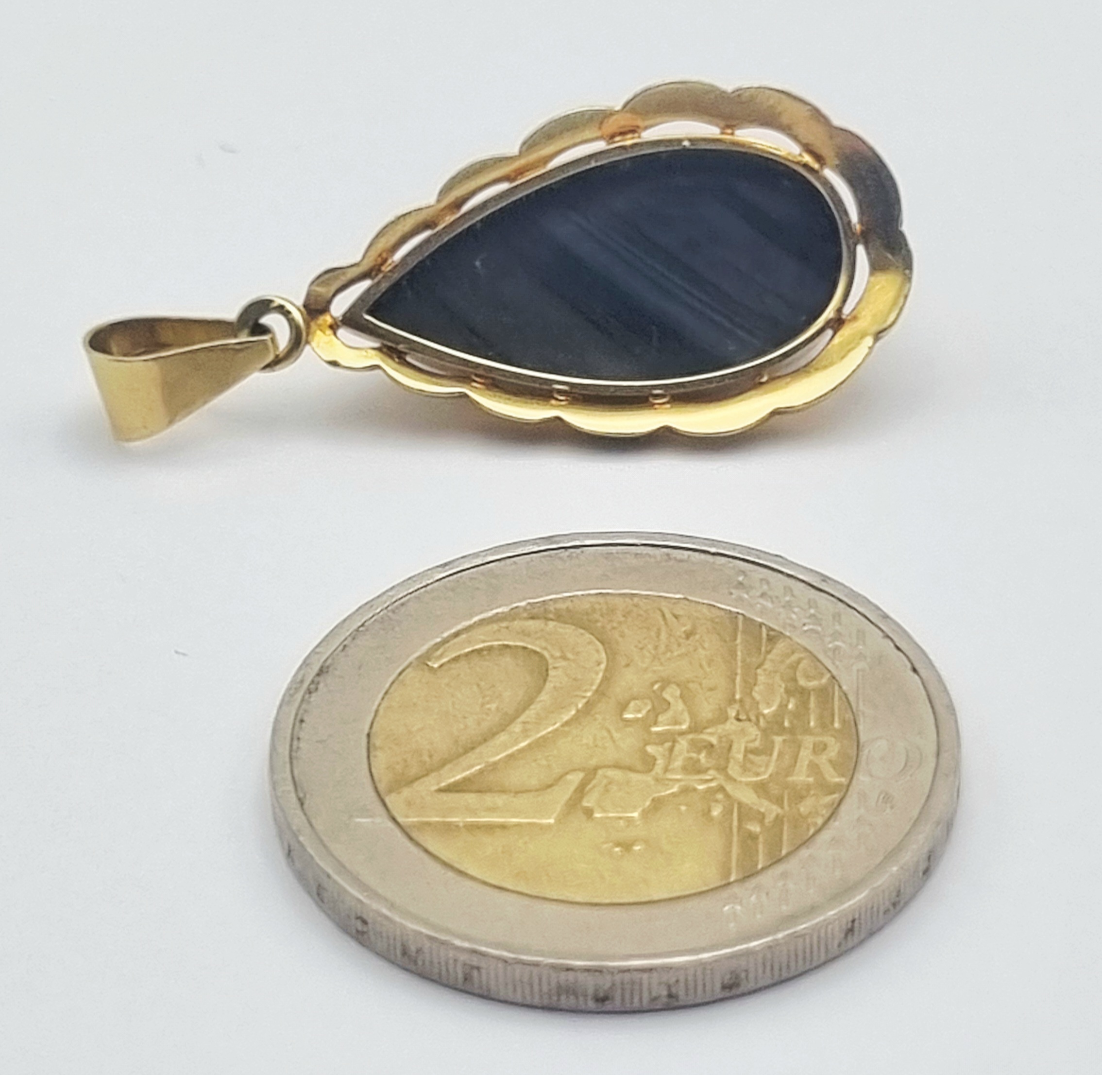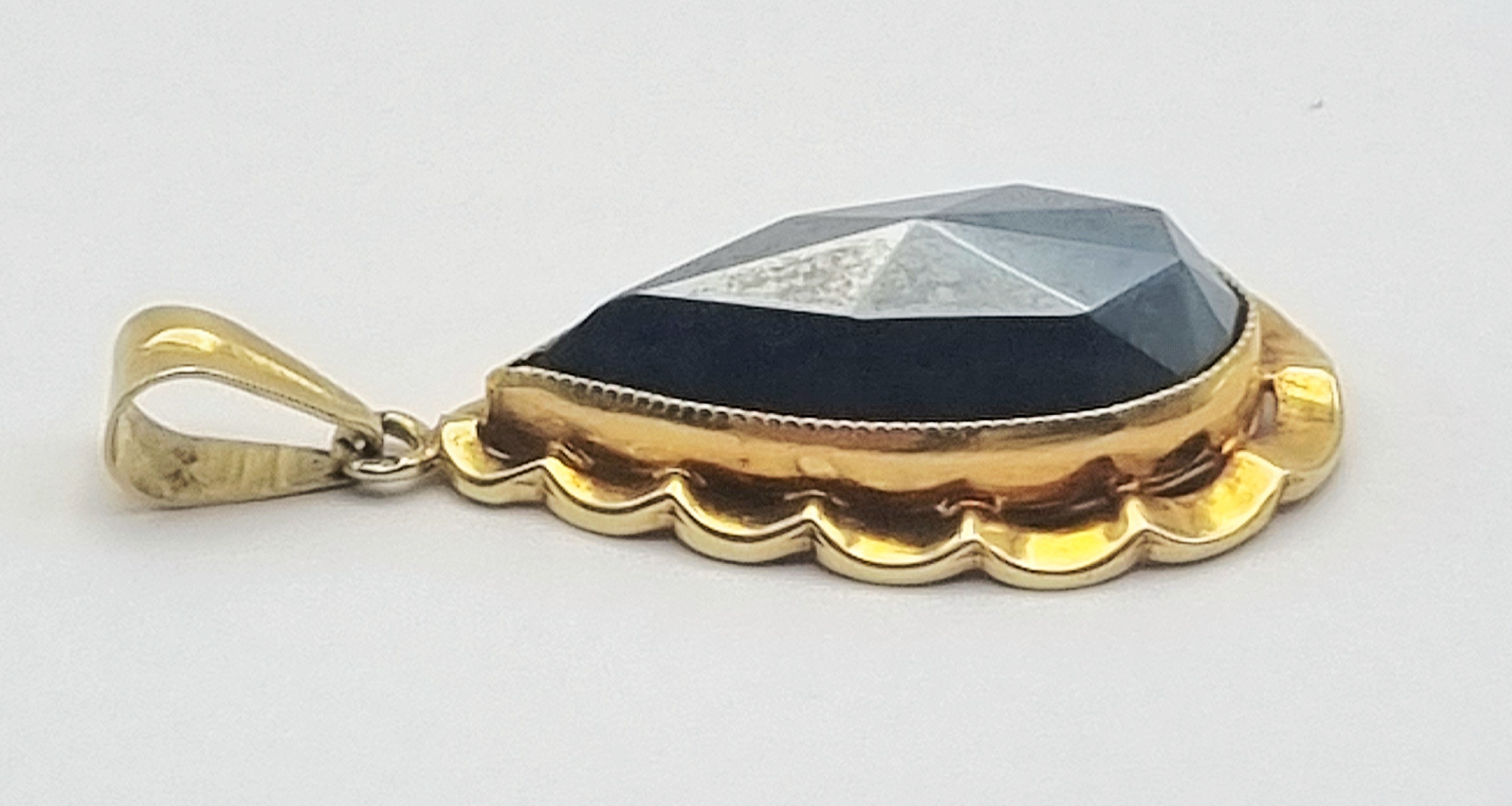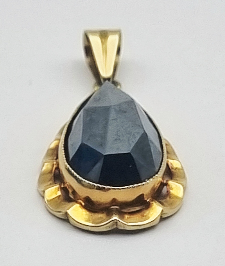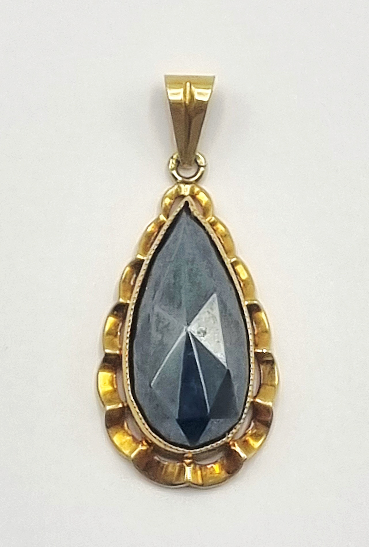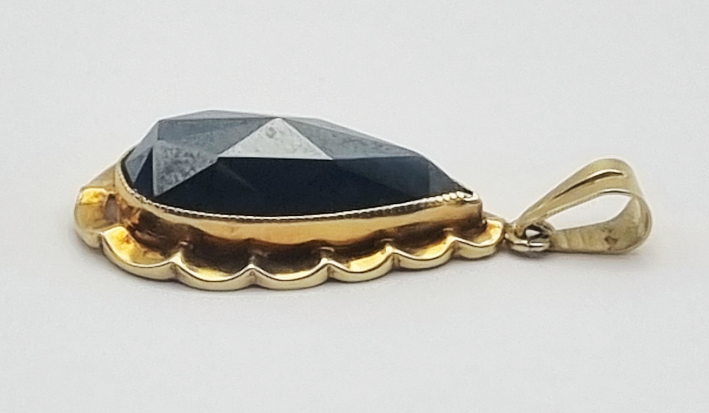 Gouden 14-karaats hanger met een centraal geplaatste, donkere granaat in peervormig facetslijpsel. De hanger toont een decoratieve omlijsting met een geschulpte rand. Datering midden 20e eeuw. De hanger zelf beoordelen? Je bent welkom op onze kijkdagen op 10, 11 en 12 april! |