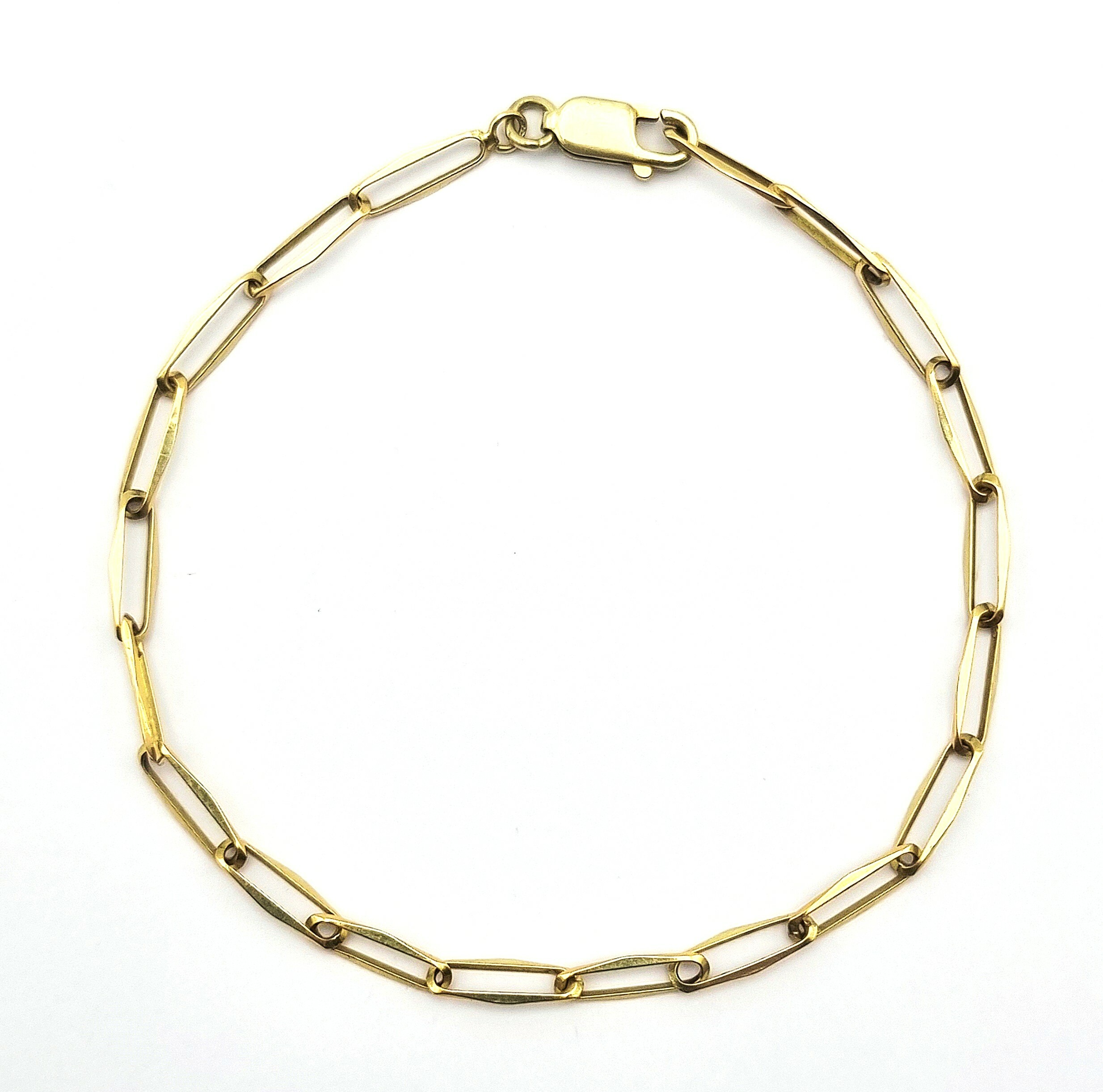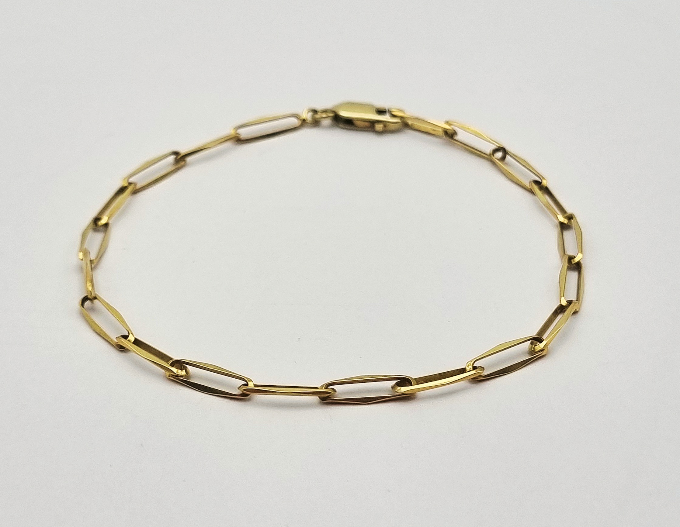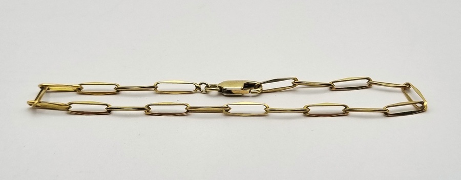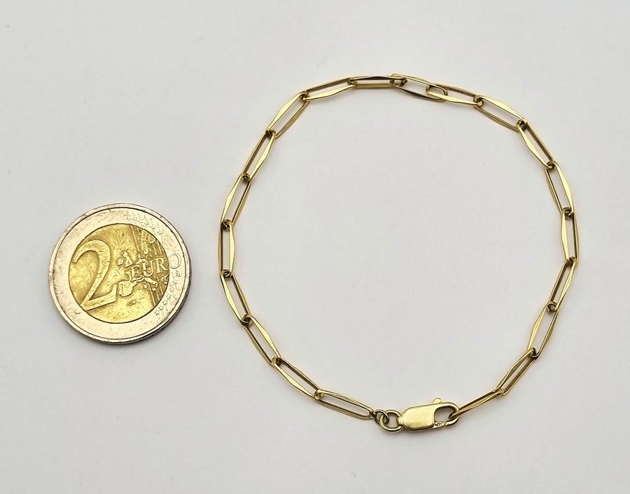 Gouden 14-karaats armband uitgevoerd met langwerpige gefacetteerde schakels, het zogenaamde paperclip-ontwerp. Het sieraad is vervaardigd uit geelgoud en gemerkt met 585 goudkeurmerk op de karabijnsluiting. Datering circa 2000. Geïnteresseerd? Bezoek onze kijkdagen op 10, 11 en 12 april van 11:00 tot 17:00 uur! |