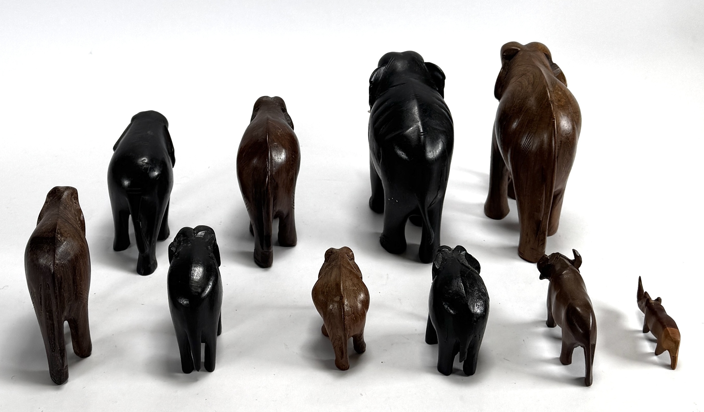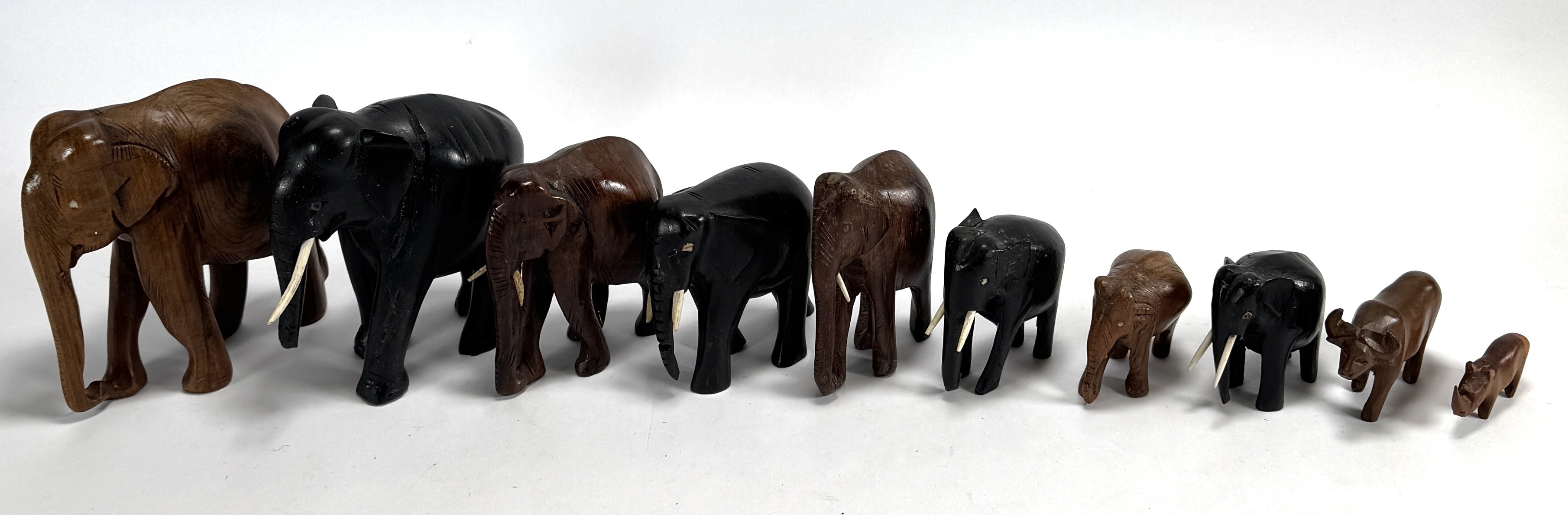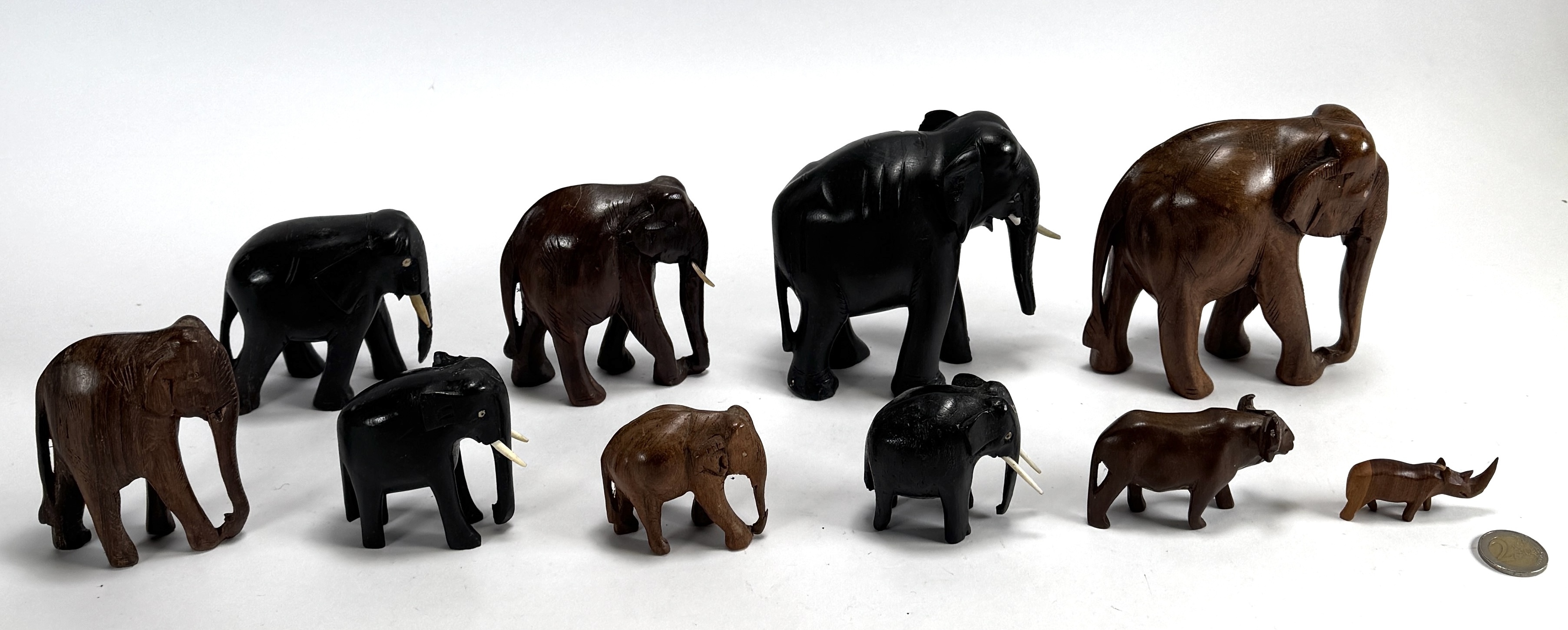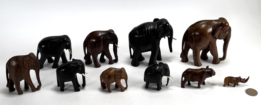 Tien dierfiguren van handgesneden ebben- en hardhout, acht olifanten met deels ingezette slagtanden, een waterbuffel en een neushoorn. Deze dieren dateren uit circa 1960 en hebben een Oost-Afrikaanse herkomst. De figuren tonen een karakteristieke gepolijste afwerking en gestileerde anatomische vormen. Registreer nu en bied eenvoudig online mee op deze dierfiguren! |