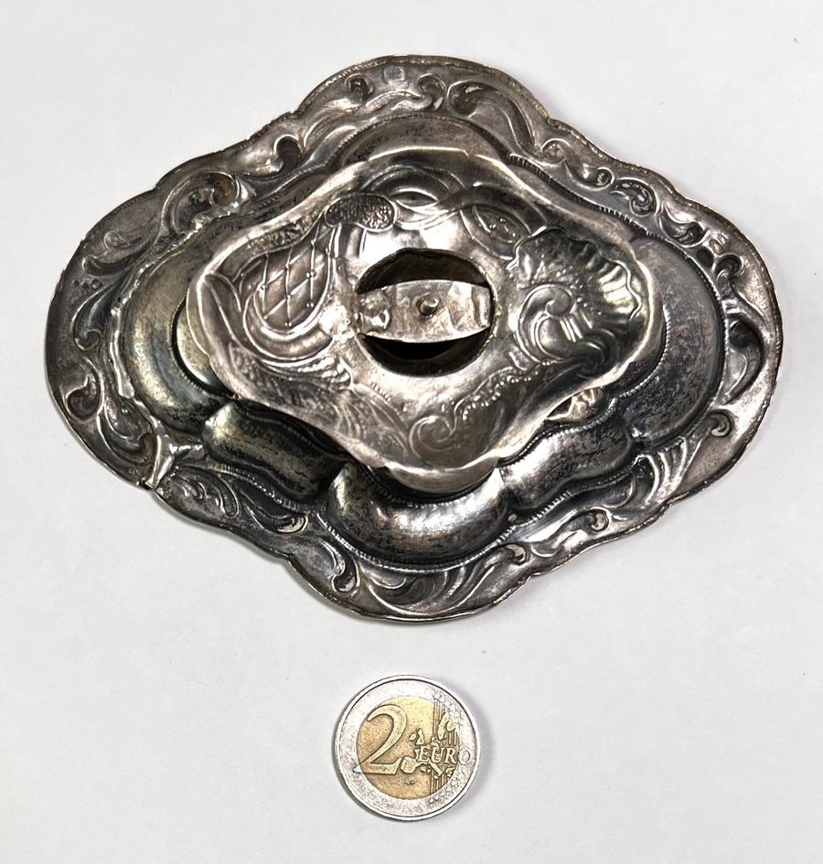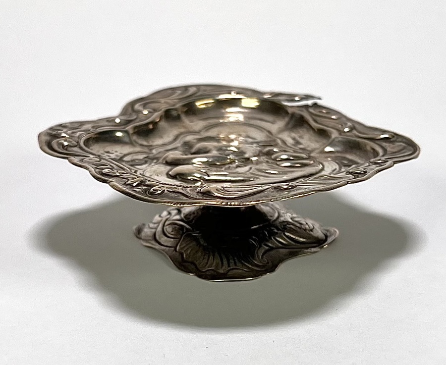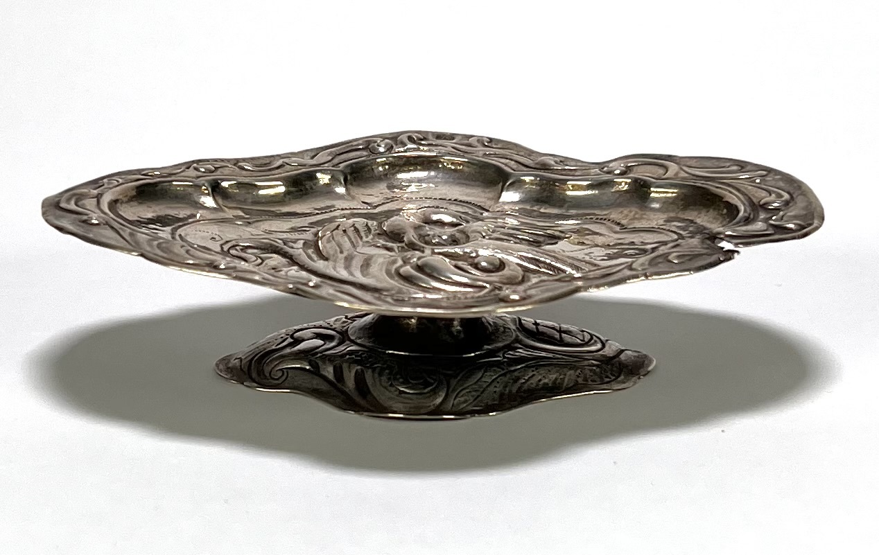 Zilveren schaaltje op voet in neobarokke stijl, 19e eeuw. De gelobde schaal toont een centraal gedreven motief van een pelikaan die haar jong voedt met haar eigen bloed, een traditioneel christelijk symbool voor opoffering. De opstaande rand is afgewerkt met geciseleerde C-voluten. Bovenblad en geprofileerde basis zijn verbonden middels een schroefconstructie. Het zilverwerk is voorzien van een ingeslagen rechthoekig meesterteken JS. Geïnteresseerd? Bezoek onze kijkdagen op 10, 11 en 12 april van 11:00 tot 17:00 uur! |