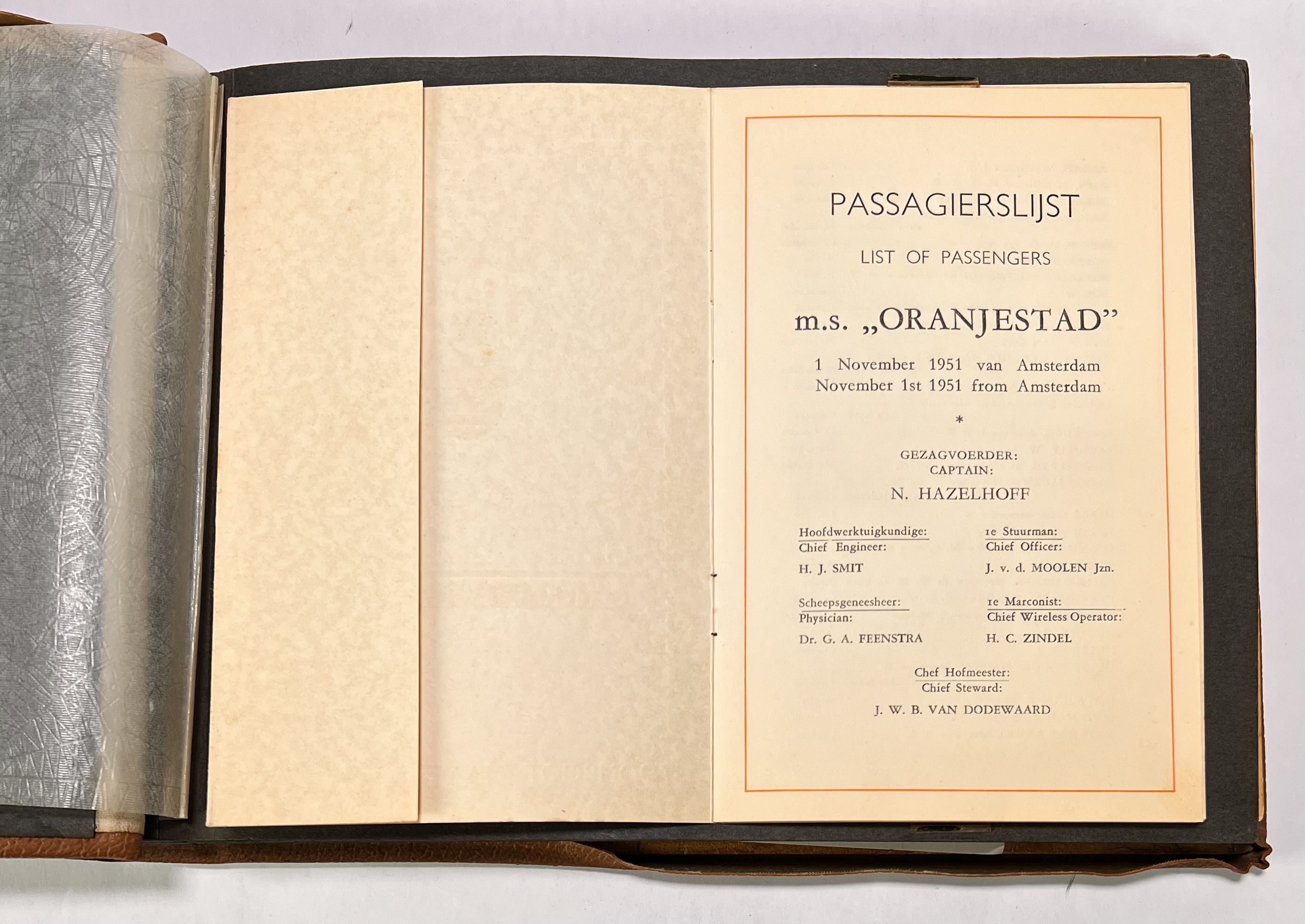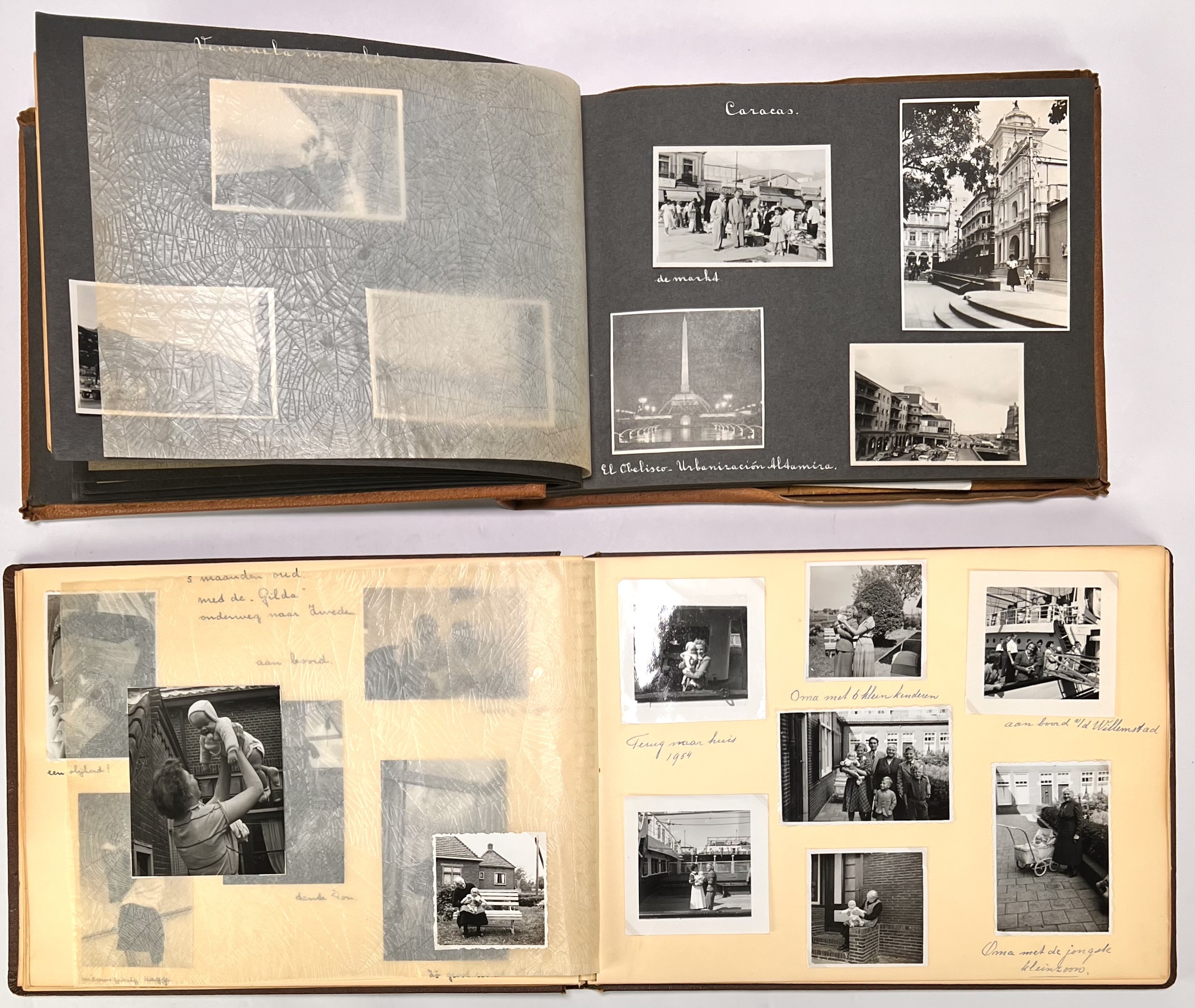Fotoalbums en filmrol, naoorlogse documentatiecultuur, vervaardigd uit papier, karton, leer, fotografisch papier en film, albuminbinding en handgeschreven annotaties. Het ensemble bevat meerdere albums met portret- en reisopnamen, ephemera waaronder een passagierslijst van m.s. “Oranjestad” (1951) en een gelabelde filmrol uit 1953. Het geheel dateert uit 1951–1953 en heeft een Nederlandse en Caribische herkomst. Geïnteresseerd? Bezoek onze kijkdagen van 11:00 tot 17:00 uur. |