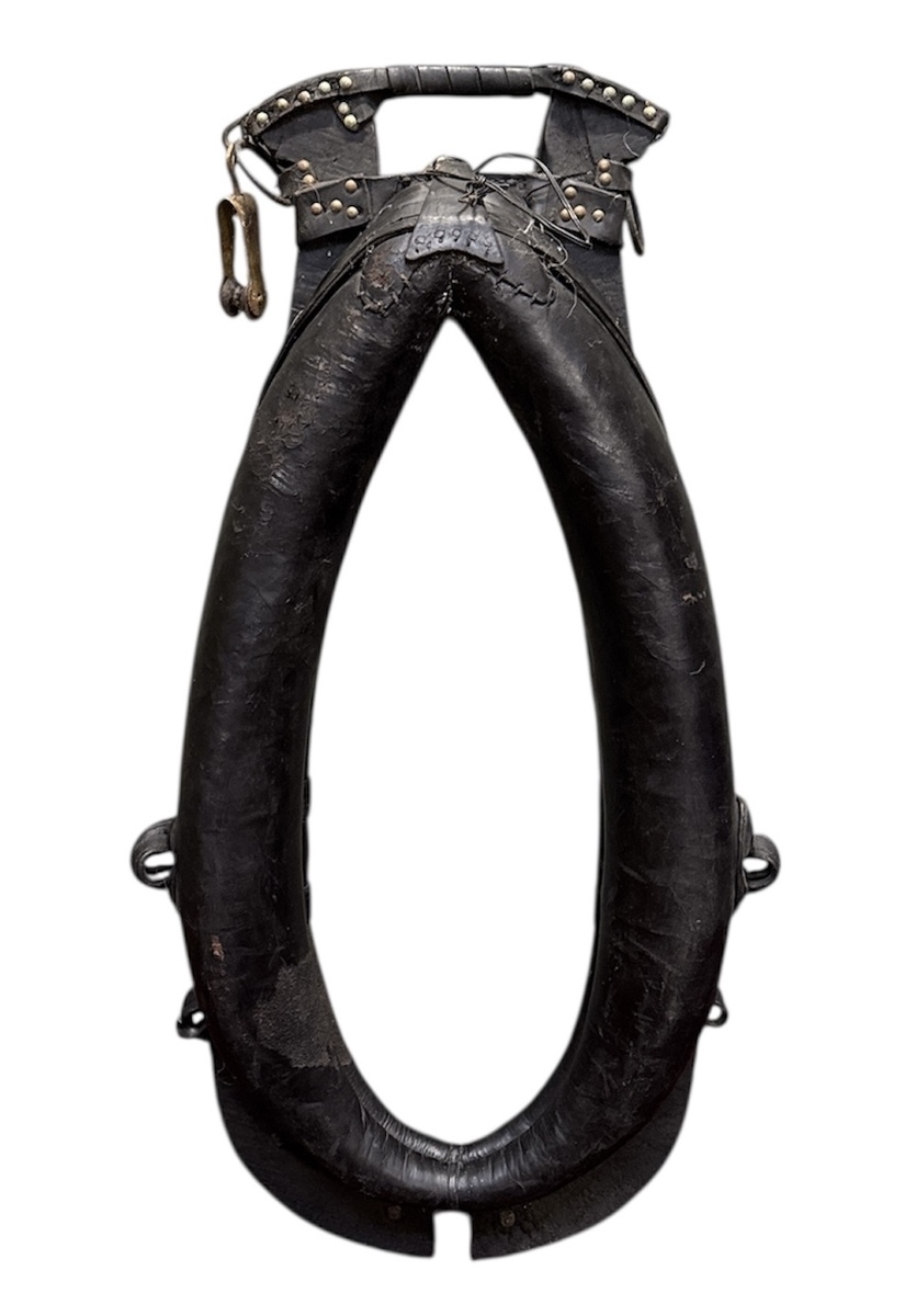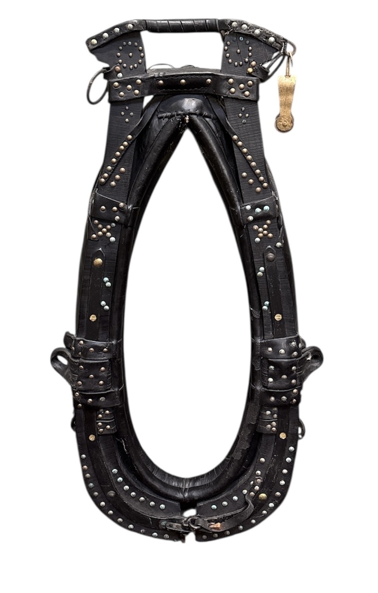 Paardenhaam in agrarische volkskunsttraditie, vervaardigd uit leer met houten kern en metalen beslag, uitgevoerd als functioneel gareel voor trekpaarden. Kenmerkend zijn de ovale vorm met met leer overtrokken kussens, rijk voorzien van klinknagels, gespen en ophangringen. Het object dateert uit de 19e eeuw en heeft een Europese herkomst Wil je direct deelnemen? Plaats alvast een schriftelijk bod via onze website! |