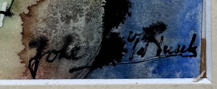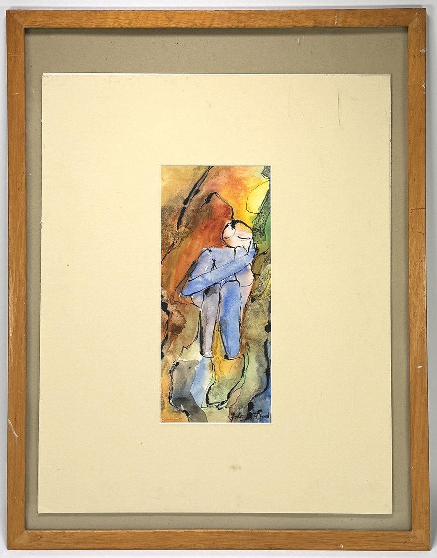 Tekening door Joke van der Tuuk (1946) toont een gehurkt menselijke figuur in expressionistische stijl, uitgevoerd in aquarel en inkt op papier. De vloeiende kleurvelden in oker- en blauwtinten worden doorsneden door zwarte inktlijnen. Rechtsonder gesigneerd, het werk dateert uit circa 1970 en heeft een Nederlandse herkomst. Kom langs tijdens de kijkdagen (10 t/m 12 april) en ontdek deze tekening zelf! |